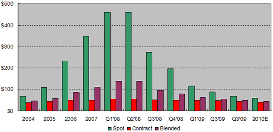 太阳能电池制造商把重点放在降低成本以维持一定获利率的同时,也将持续推动电价往Grid Parity (太阳发电成本与传统发电成本相当)的方向进行。主要降低成本的方法包括使用较少的硅,或使用较便宜的硅。多晶硅(Polysilicon)是主要用于制造结晶硅(c-Si)太阳能电池的晶圆材料。而其占到整体太阳能??槌杀镜?5%到20%。由于大量多晶硅新产能的开出以及过去这一年的需求减少,硅晶的价格自2008年下半年起因供过于求而大幅下跌,目前虽然跌势已经趋缓,但预计2010年仍为供过于求的状况,因此价格将持续下降。图2为多晶硅价格趋势。