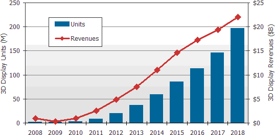 - 预估立体3D显示器市场将从2008年的70万台,到2018年将成长到1亿960万台