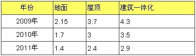 与此同时的各地政府也纷纷出台政策刺激光伏电站的发展,杭州市提出“阳光屋顶”计划,广州,南昌,无锡,保定,上海纷纷提出了本地的光伏电站发展规划,中国光伏最发达的江苏省率先出台了《太阳能光电建筑应用财政补助资金管理暂行办法》,其中规定,通过3年努力,力争在全省建成光伏并网发电装机容量400兆瓦,2009-2011年分年度目标电价为: