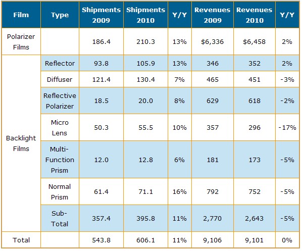 根据DisplaySearch在光学膜领域调研指出,2009年全球TFT LCD用光学膜出货面积估计达到5亿4千3百万平方米,同时预估2010年光学膜出货将持续增长到6亿零6百万平方米,年成长率将达11%。不过由于平均销售价格不断下滑,我们估计2010年出货金额将与今年持平在91亿美元水平。另一方面随着绿色显示器需求与LED背光市场增长驱动新一波背光设计发展,使得如棱镜片(prism films)、反射式偏光片(reflective polarizers)或者micro-lens films等产品的需求也跟着提高;对于能持续提高技术能力的厂商提供较佳市场机会。