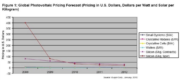 2009 年,光伏系统的平均价格下跌11%左右,而晶体硅组件的平均价格重挫了38%。iSuppli 公司预测,2010 年光伏系统的价格将下降10%,组件价格将再下跌20%。