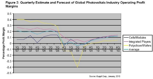 iSuppli 公司的分析结果显示,继2009 年大部分时间亏损之后,厂商在第四季度恢复盈利。预计2010 年获利情况将继续改善,但不会回升到经济衰退之前的水平。iSuppli 公司预测,光伏产业多数领域的平均利润率将在2010 年第四季度前回升到10%以上。但是,供应过剩的多晶硅领域的扭亏步伐将落在后面。驱动降低成本计划盈利情况改善的主要因素,是追上价格下跌的速度。