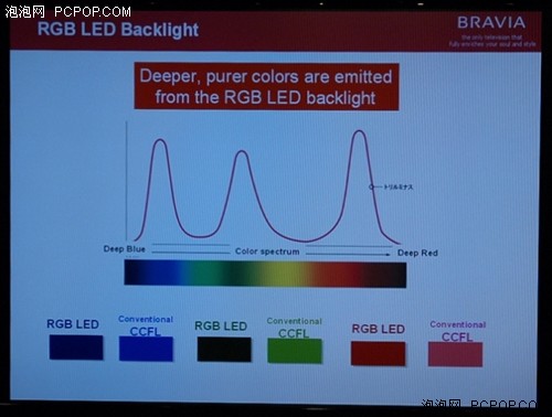 此外,RGB-LED在光谱特性上也大幅优于CCFL。RGB三种LED发出的三原色光非常纯正,能量高度集中.这点在最后的色域范围方面体现的最为明显。据工程师介绍,采用了“动态丽彩LED背光源”的BRAVIA在实验室中测得的色域范围已经接近普通液晶的2倍,达到了一个前所未有的新高度。因此,的旗舰BRAVIA也实现了对最新广色域标准x.v.Color的支持,如果配合使用支持x.v.Color色域的摄像机使用,消费者将看到非常逼真自然的色彩和画面。