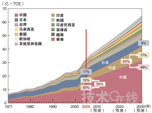 图1:持续增长的能源需求亚洲各国的能源需求变化。印度的增加率较高