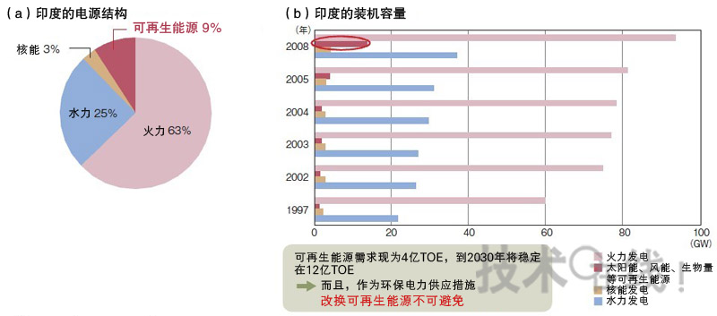 为了解决上面不稳定的电力供应和环境问题,可再生能源成为了关注的焦点。民间调查机构的推测显示,到2030年,印度对于可再生能源的需求将增加到现在4亿TOE(石油换算吨)的3倍,达到12亿TOE。