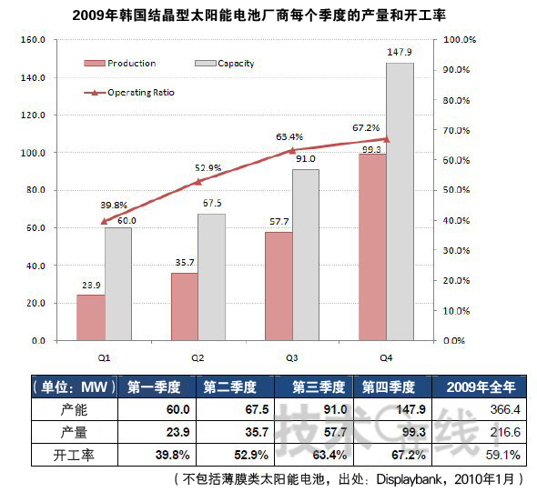 据韩国调查公司Displaybank称,韩国结晶硅型太阳能电池厂商的设备开工率已经恢复。受经济?;挠跋?,韩国结晶硅型太阳能电池厂商的设备开工率在2009年第一季度跌至39.8%,但在2009年第四季度已提高至67.2%。