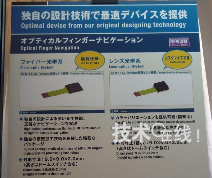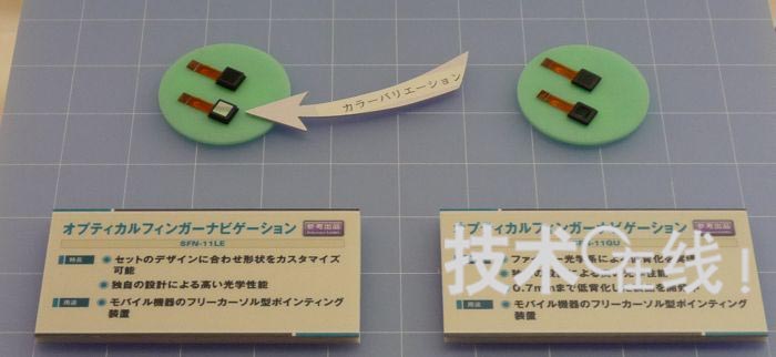 三美电机开发出了厚度仅为2mm的光学式输入传感器???ldquo;SFN-11GU”。设想用于用一根拇指在手机画面上进行操作的用途。解说员表示,“如果是触摸面板的话,大多数情况下需要一手拿着手机,用另一只手的手指碰触画面进行操作,而有些顾客希望可以只用单手进行操作”。该产品已经用于便携终端产品中。