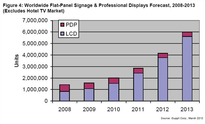 在今年出货的将近大约200万块数字标牌和专业显示器中,整整四分之三,即152万块将是液晶显示器,其它的468752块是等离子显示器。