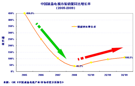 - 到2009年3季度,中国液晶电视市场销量规模同比增长超过100%
