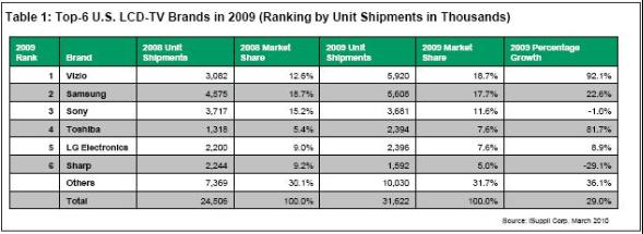 据iSuppli公司,Vizio在2009年成为美国市场的领先液晶电视品牌,而三星电子则在总体平板电视市场排名第一。