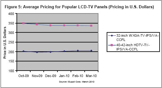 图5所示为2009年10月至2010年3月流行液晶面板的平均价格走势。另外,面板价格较高,也影响了品牌电视厂商的利润率。因此,预计较高的库存水平还将保持两到三周,这将导致电视面板需求速度下降。