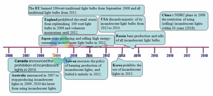 面对全球气候变迁与不断高涨的能源价格,各国政府都已经开始把一些高耗能的产品列为首要的禁用对象,例如白炽灯泡就是最为明显的桉例。白炽灯泡的禁用首先从欧盟与日本最先开始发酵,后来各国政府也开始陆续跟进。从各国禁用白炽灯泡的时间表来观察,LEDinside表示,2012年之后,大多数国家开始逐步禁用白炽灯泡,也为LED照明带来庞大的商机。