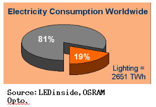 依现阶段照明占全球电力消耗的比重达19%,耗能总量达到2651 TWH。如果能够将现有的光源替换成节能光源,预计将可以省下30%能源消耗。若再进一步将节能光源与感测器、智能电网等相关应用作结合,预计还可以再节省30%的能源消耗。 如果到2030年能够节省50%的能耗,相当于减少20亿桶的石油的二氧化碳排放量。