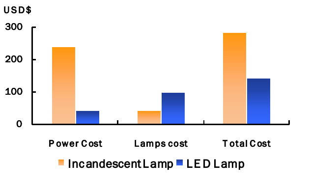 以7W的 LED灯泡为例,2009年初,一颗7W LED灯泡成本将近15美元到20美元,零售价格多半在50美元以上。不过随着LED成本的降低,目前7W LED灯泡成本下降至12元美金左右。零售价格也压低到30美元附近。而随着LED灯泡成本下降,LED灯泡替代白炽灯泡的优势越趋明显。