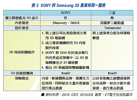 然而,消費者要的不是一台高科技電視,更要豐富的閱聽內容。以3D影像產業而言,除了需要強大硬體裝置支援外,其豐富的3D內容支援也是相當重要的。09年的CES展,許多大廠開始拉攏平台與內容業者一同站台,因為他們知道光是只有硬體不能讓消費者買單,多元的加值服務才是消費性電子未來的趨勢。2010年的CES展,同樣也是依循前年的模式,而且力道更加強勁,以補強各自提出自有的硬體解決方案。另一方面,以SONY與三星來說,兩家公司同時都與RealD技術合作以獲取3D的專利技術,以避免專利侵權的問題發生,就以產業現況來看,頗有烘抬3D產業的味道(見表二)。