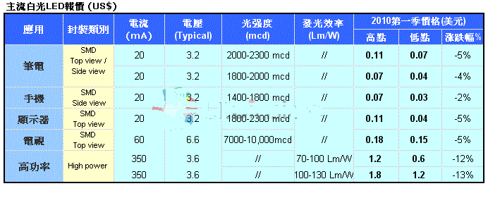 而在照明应用的高功率LED部分,则由于亮度在70-90lm/W的供给增多,加上照明市场明显增温,厂商为扩展市场佔有率,2010年Q1的照明用LED价格跌幅明显大于背光用LED的价格。