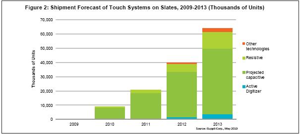 图2所示为iSuppli公司对于2009-2013年平板电脑市场触摸系统的预测。