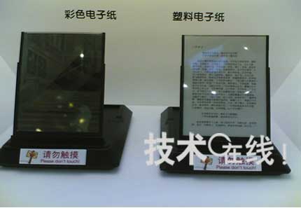 此次三星带来了独自开发的塑料和彩色电子纸。塑料电子纸为16阶色,彩色电子纸只能显示4%的NTSC色域,所用材料为塑料,并将门电路集成到塑料基板上,大小为10.1英寸。塑料电子纸和彩色电子纸的厚度分别为0.7mm和0.5mm。据三星的工作人员介绍,其电子纸均从E ink采购电泳层,然后生产出半成品后,销售给其他电子书厂商。