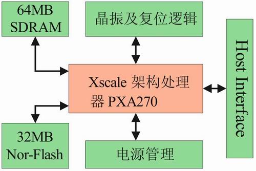 处理器部分的硬件构成如图2所示,是由嵌入式处理器XScalePXA270(主频520MHz)、SDRAM(64Mbyte,由2片16位的SDRAM芯片HY57V561620FTP-H组成32位接口)、FLASH(32MbyteNor-Flash,由2片IntelE28F128J3A组成32位接口)、电源管理部分(采用MAX1586CETM,Maxim的PMIC)及晶振复位逻辑电路等Marvell的嵌入式处理器PXA270,其核心是采用XScale架构,拥有高性能、低功耗的多媒体加速能力,能够很好的支持MPEG4和MP3解码;通过结合QuickCapture技术,它可以支持高达400万像素的摄像头;它内建256K字节的SRAM,支持英特尔StrataFlash内存;SpeedStep省电技术;支持Baseband接口、USBon-the-go(OTG)。