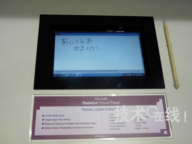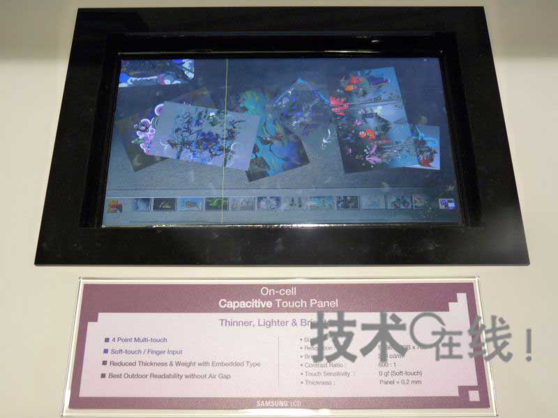 韩国三星电子此次展出了两款内置触摸面板功能的On Cell方式液晶面板。分别为是(1)嵌入电阻膜式触摸面板功能的10.1英寸液晶面板,以及(2)嵌入静电容量式触摸面板功能的13.3英寸液晶面板。两款产品均可4点输入。目前正以2011年开始量产为目标推进开发。