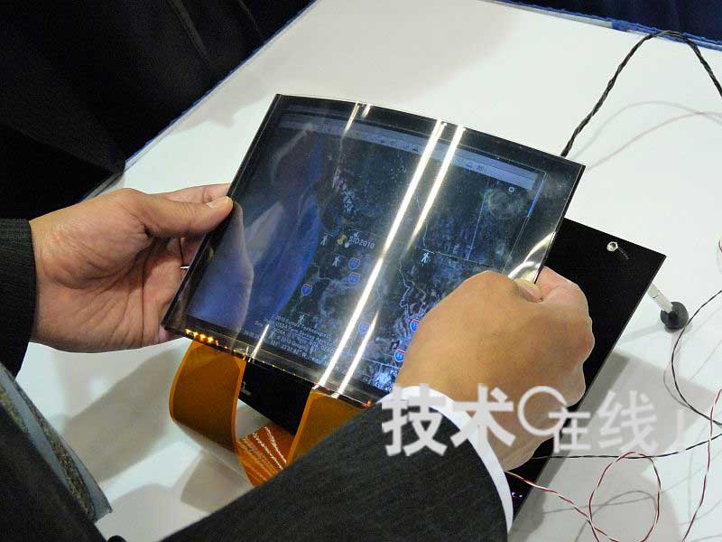 东芝开发出了可通过弯曲显示器来放大或缩小显示图像的柔性液晶面板,并在全球最大的显示器国际会议“SID 2010”上进行了发布(论文编号:54.4L)。在AUTHOR INTERVIEWS上,东芝向观众演示了通过实际弯曲液晶面板,来放大或缩小画面上显示的“Google Earth”航摄照片。这种利用柔性显示器特点的直观操作,吸引了许多技术人员的关注。