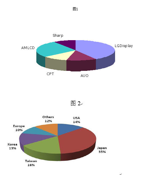 数据显示,国内所有的LED TV面板来源全部进口,其中有部分open cell的模式,但是背光模组仍是采用指定购买的方式。从中国大陆地区LED面板供应来源来看,以2010年第一季度为例,主要供货来源为LG Display, AMLCD, AUO, CPT(如图1),其中CPT供货多数为小尺寸。而从全球LED面板产值来看,日本厂商目前为市场领导者,台湾和韩国厂商积极扩大产值(如图2)。由此来看,LED TV面板产业市场集中度非常高,未来的LED TV市场的竞争格局主要受限于厂商的资源分配情况。