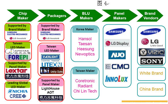 为缓解资源紧缺的状况,在过去两年的整合并购中,面板厂和整机厂扮演了关键的角色(图4),全球LED领域的资源布局雏形已然成型。