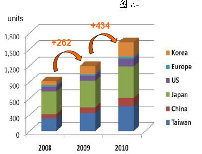 晶粒方面,预估全球MOCVD数量逐步增加(图5),其中以韩国和台湾厂商最为积极,Samsung, LG Innotek以及AUO旗下的Lextar都将增加MOCVD机台数量至目前的2~3倍。到2010年底,预计全球高亮度LED晶粒月产能将接近200亿,但目前市场应用仍以移动终端产品和汽车照明用为主,前两者的应用比重高达55%,但TV用背光源应用比重总体仍将难突破20%,因此背光源缺货状况的缓解将需要较长时间。