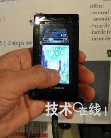 演示中使用了安装有试制品、类似手机的小型影像显示设备(图1)。演示了用户接触触摸面板的力度变化,导致画面上显示的图标切换速度变化的情形。按压力度越强,图标的切换速度就越快。