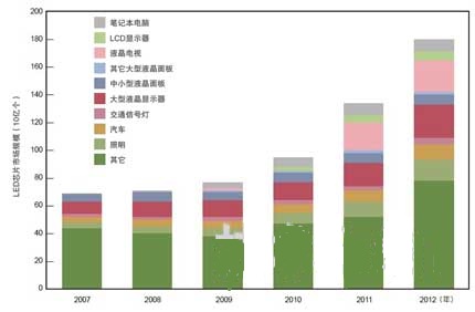 图中为分用途的LED市场预测。设想到2012年以前,LCD TV市场将以年率120%增长。图由依DisplaySearch的资料所制。