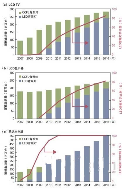 LED 图中为依LCD TV、LCD显示器与笔记本电脑用液晶面板不同光源的预测。预估2016年将有85%的LCD TV使用LED。