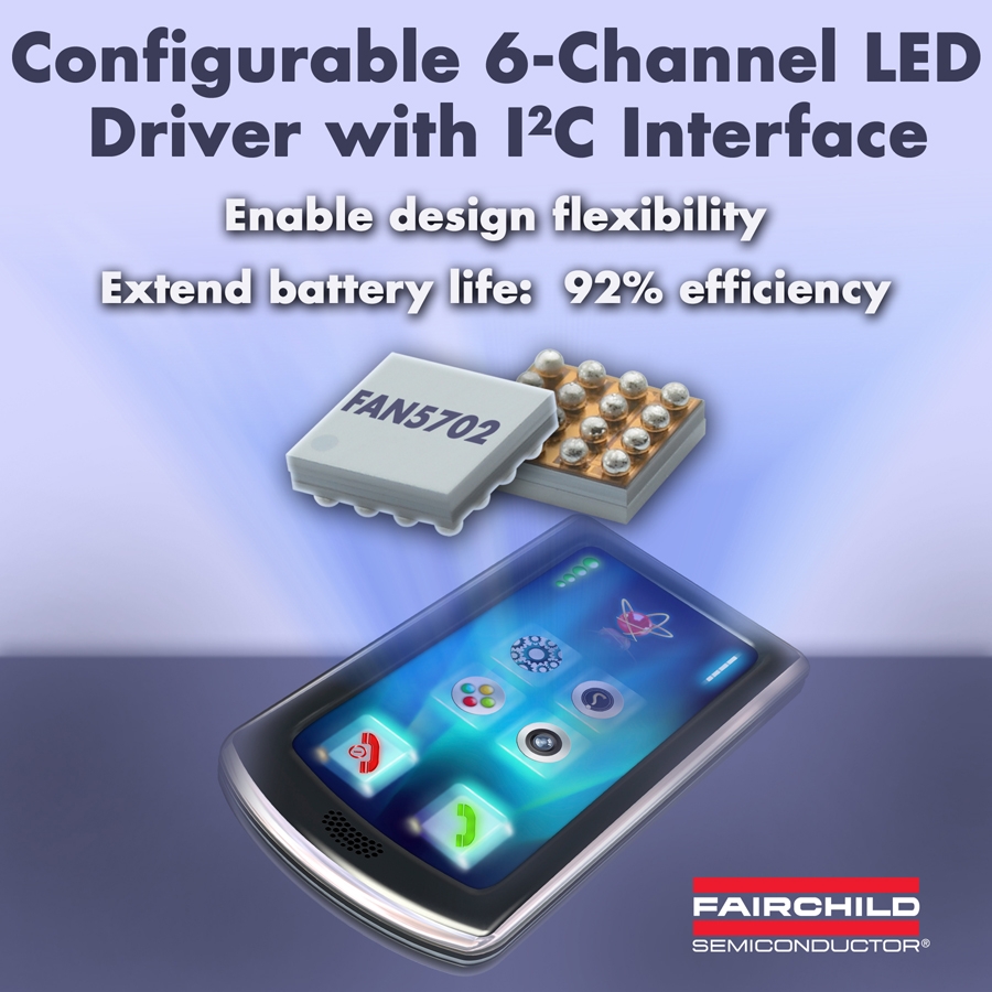 FAN5702是具有I2C 接口的可配置、180mA、6通道LED驱动器,可提供以下优势: