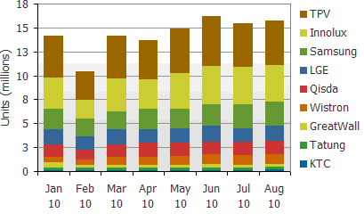 图二: 2010年1月到8月全球前九大液晶显示器代工厂生产计划