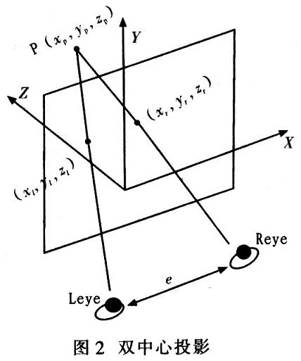 由以上研究可知,立体图像对的产生是由于左、右眼观察到的物体透视结果不同。因此在立体显示的视景仿真中设置两只虚拟的眼睛,一个获取左眼的图像,另一个获取右眼的图像,分别将左右眼的图像传送给相应的眼睛。因此。在立体显示中,需要采用包含两个视点的透视投影方法一双中心投影算法。图2为双中心投影。