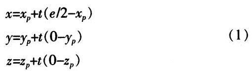 左视点Leye和右视点Reye均位于X轴上,两视点间的距离为e,两视点连线中心为坐标原点,则左视点的坐标为(-e/2,0,0),右视点的坐标为(+e/2,0,0)。投影平面平行于XY平面,到左右视点的距离均为d。三维空间中一点P(xp,yp,zp)在左视点投影中的坐标为(xl,yl,zl),在右视点投影中的坐标为(xr,yr,zr),则zl=zr=d。点P(xp,yp,zp)和Reye投影线的参数方程为: