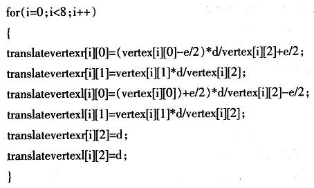 按上述投影算法计算出立体图像对后,应用OpenGL绘制立体图像对,分别用红、绿两种颜色绘制右眼和左眼的图像。以一个变长为10cm,中心点在原点的正方体为例,设两视点间距离e为5cm,投影面距高观察者d为40cm,考察正方体的一个顶点(5,5,5),由上述投影算法可得:xr=32cm,xl=48cm,yl=yr=4040cm,zr=zl=d=40cm对8个顶点分别计算后,连接相应的立体透视投影点,即可得该立方体的立体图像对。用数组vertex[8][3]存储顶点,数组translatevertexr[8][3]存储右眼投影计算后坐标,数组translatevertexl[8][3]存储左眼投影计算后的坐标,对相应的点进行投影计算: