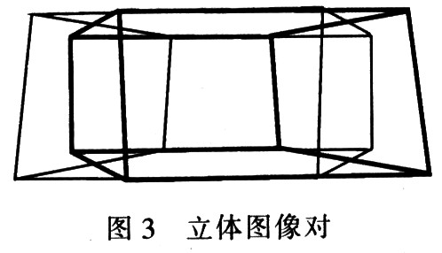 使用简单的滤光镜就可观察有立体感的图像。其原理是:由于滤光片(实验中使用红、绿滤光片)吸收其他光线,只让相同颜色的光线通过,因此左、右眼各透过不同颜色的光。当使用滤光镜观察计算机屏幕上的立体图像对时,就会看到具有深度感受的图像。在实验中发现,刷新频率对图像立体效果的形成具有重要作用。刷新频率过低,由于人眼所维持的图像已消失,不能得到三维立体感受;刷新频率过高就会出现一只眼睛可看到两幅图像的现象。将显示的刷新频率设置合适,在程序中设置图像刷新频率设置为50Hz,利用红绿滤光镜观察模型的立体成像,得到较明显的立体视觉效果。