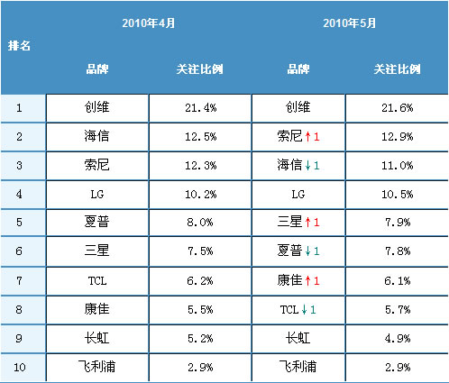2010年5月,中国液晶电视市场最值得注意的即为索尼品牌的关注比例较海信高出1.9%,成功超越海信成为关注品牌亚军。