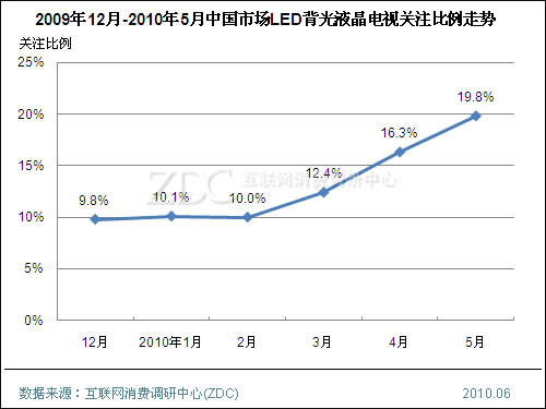 自2009年下半年开始,LED背光液晶电视开始放量增长,各大品牌均提高了LED背光在新品中的应用比例。自2010年3月起,LED背光液晶电视的消费者关注比例开始快速上升,到5月已经增加到19.8%,较年初提高近一倍。