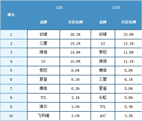 2010年5月,在中国LED背光液晶电视市场三星超越了海信成为关注亚军,5个国外品牌在中国LED背光液晶电视市场的累计关注比例达到45.2%。此前阻碍国外品牌LED背光液晶电视发展的主要因素即为相对高昂的价格,而目前众多国外品牌也已经加入到价格战中来,通过直接降价或提供丰厚赠品的方式来抢夺市场份额。