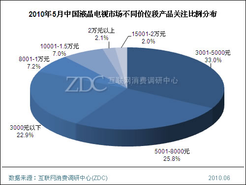 5月,3001-5000元的液晶电视产品吸引了33%的消费者关注度,较上月升高了0.5%,而3000元以下的入门级液晶电视产品吸引了22.9%的消费者关注度,较上月提高了2.6%。而5001-8000元价位段的大中尺寸液晶电视的消费者关注比例较上月减少了4.1%。