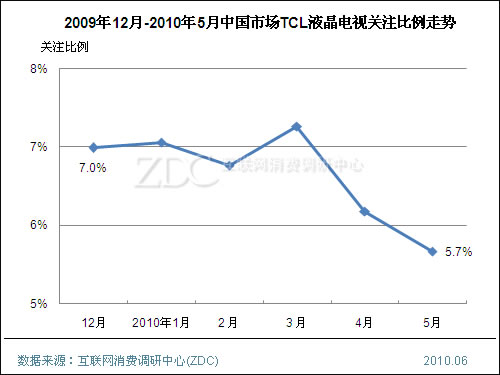 2009年,TCL在互联网电视领域表现不俗,全年TCL液晶电视全球销量为842万台,同比增长了101%。在2010年第一季度TCL的品牌关注比例走势平稳,但4月开始其品牌关注比例有小幅下滑,5月已经下滑至5.7%,排名下滑两位。