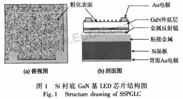从结构图中看出,Si衬底芯片为倒装薄膜结构,从下至上依次为背面Au电极、Si基板、粘接金属、金属反射镜(p欧姆电极)、GaN外延层、粗化表面和Au电极。这种结构芯片电流垂直分布,衬底热导率高,可靠性高;发光层背面为金属反射镜,表面有粗化结构,取光效率高。[page]