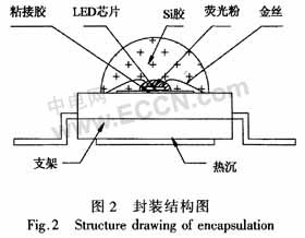 Si衬底的功率型GaN基LED封装采用仿流明的支架封装形式,其外形有朗柏型、矩形和双翼型。其制作过程为:使用导热系数较高的194合金金属支架,先将LED芯片粘接在金属支架的反光杯底部,再通过键合工艺将金属引线连接LED芯片与金属支架电极,完成电气连接,最后用有机封装材料(如Si胶)覆盖芯片和电极引线,形成封装?;ず凸庋ǖ馈U庵址庾岸杂谌」庑?、散热性能、加大工作电流密度的设计都是最佳的。其主要特点包括:热阻低(小于10℃/W),可靠性高,封装内部填充稳定的柔性胶凝体,在-40~120℃范围,不会因温度骤变产生的内应力,使金丝与支架断开,并防止有机封装材料变黄,引线框架也不会因氧化而沾污;优化的封装结构设计使光学效率、外量子效率性能优异,其结构见图2。