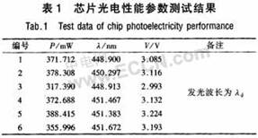 通过优化Si衬底表面的处理和缓冲层结构,成功生长出可用于大功率芯片的外延材料。采用Pt电极作为反射镜,成功实现大功率芯片的薄膜转移。采用银作为反射镜,大大提高了反射效率,通过改进反射镜的设计并引入粗化技术,提高了光输出功率。改进了Ag反射镜蒸镀前p型GaN表面的清洗工艺和晶片焊接工艺,改善了银反射镜的欧姆接触,量子阱前引入缓冲结构,提高了芯片发光效率,优化量子阱/垒界面生长工艺,发光效率进一步提高,通过改进焊接技术,减少了衬底转移过程中芯片裂纹问题,芯片制备的良率大幅度提高,且可靠性获得改善。通过上述多项技术的应用和改进,成功制备出尺寸1mm×1mm,350mA下光输出功率大于380mW的蓝色发光芯片,发光波长451nm,工作电压3.2V,完成课题规定的指标。表1为芯片光电性能参数测试结果。