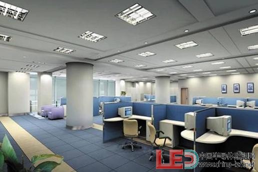 办公场所有一般办公室、写字楼、商务中心等。由于办公场所的特殊性,要求办公人员需要长时间的保持头脑清新,舒适和平和的心态,工作高效而不感疲倦。办公室一般在白天的使用率最高,办公空间的采光通常根据办公功能的需要,在对自然光充分利用的同时,结合人工照明,以保持稳定、合理、舒适、健康的光环境。照明的目的就是要创造一个良好的工作环境,符合照度要求,又照度均匀;减少灯具的频闪效应和眩光,以减少办公人员视觉的疲劳程度。因此应采用偏冷的光色,色温常在4200~5300K,较接近早晨的照明,以保持冷静、清醒的头脑。可采用裸灯管吸顶安装,也可采用金属反光荧光灯吊装,写字楼、常采用铝合金反光格栅荧光灯嵌入吊顶安装。