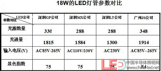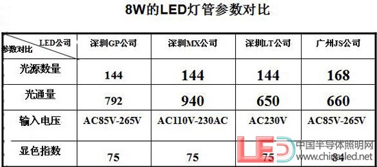 通过上面的表格可以看出,以上我们任意选择的四家公司的LED灯管的相关结果数据有的参数会有会有一定的差别,选用LED光源的数量从144-168颗,光通量也从650-940LM,相差的范围有290LM之多,输入的电压有宽电压,也有窄电压。显色指数基本在Ra=75左右,国家LED灯具标准出台后会有一个标准和规范。以上为各厂家自行测试结果(如上图所示)