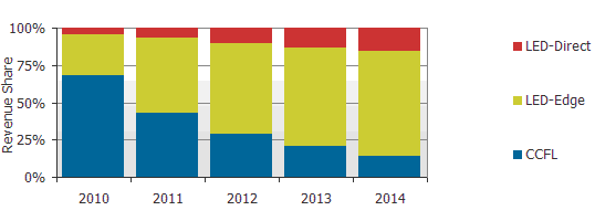 DisplaySearch预估2010年LED背光液晶电视将占所有液晶电视出货的20%,大约90%的LED背光液晶电视是使用侧光式背光源。在2011年由于LED零组件供应补足且价格下滑,LED背光液晶电视将在2012年成为主要的应用技术。随着节能观念提高与相关规定出台,以及轻薄设计流行,CCFL到LED背光源液晶电视转换速度将非??焖?。