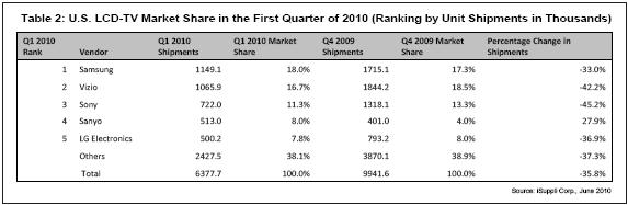 韩国三星从美国品牌Vizio手中夺回第一的排名。第一季度Vizio出货量比去年第四季度减少42.2%。在美国液晶电视市场,三星与Vizio之间争得难解难分,每个季度第一的排名都在二者之间频频易手。2010年第一季度,三星的份额比Vizio高出1.3个百分点,而2009年第四季度Vizio也领先三星同样的程度。