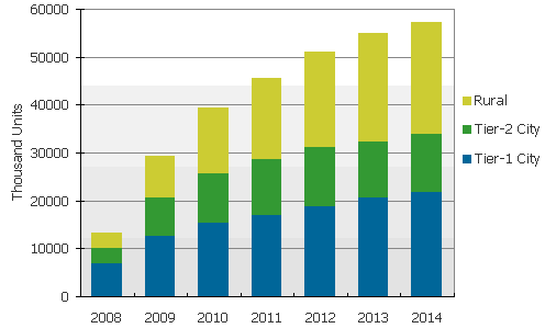 DisplaySearch最新发表「中国电视市场专题研究报告」,报告指出,在未来五年内,中国急速的都市化进程,每年约10%左右GDP(国内生产总值)成长率,以及到2011年之后,在中国境内投资的多家用于液晶电视面板的高世代TFT LCD面板厂的陆续量产,这些关键的积极因素将带来中国平面电视市场(包含液晶与等离子)维持的高成长。我们预计,中国平面电视的出货量将从2009年的3千1百万台,大幅成长至2014年的5千9百万台,年复合成长率为14%。而平面电视的市场渗透率将从2009年72%成长到2014年接近100%,传统映像管电视届时将完全消失。